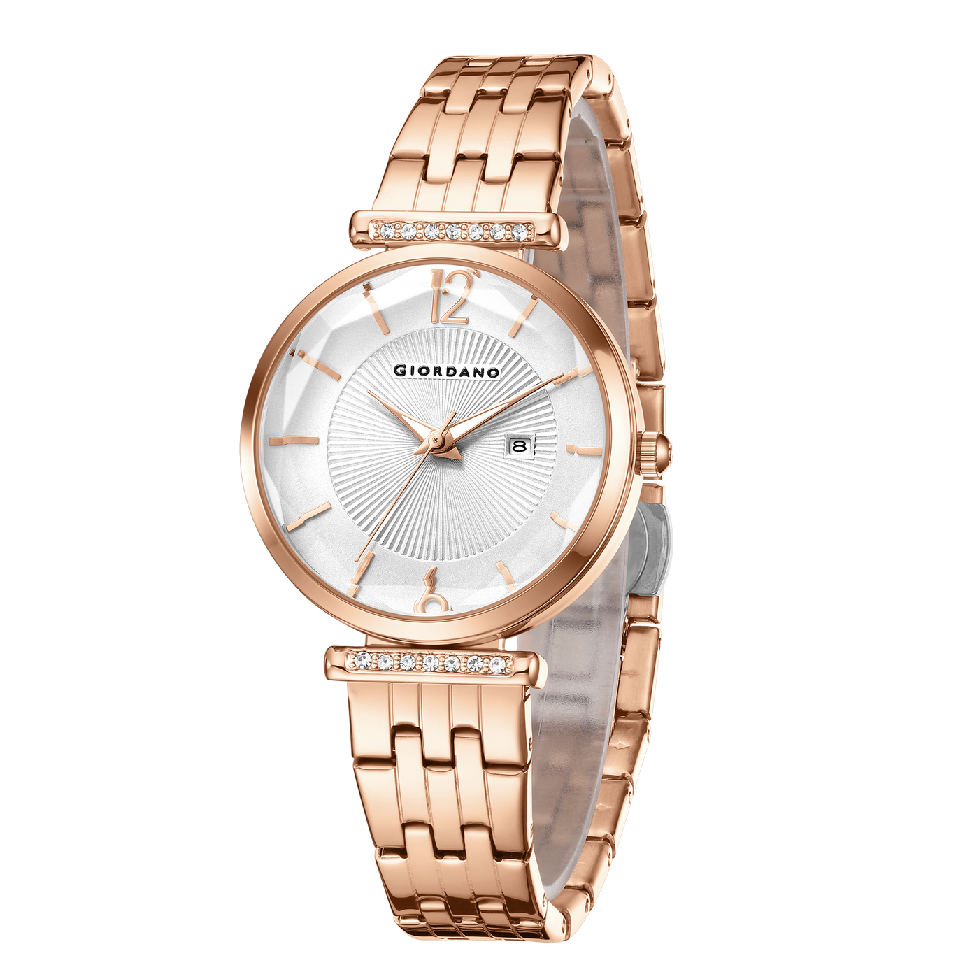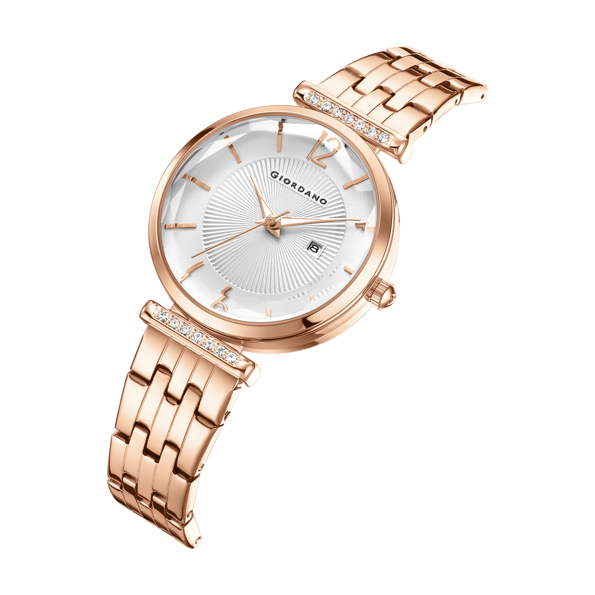 Giordano Exquisite Analog Watch for Women with Round cut glass Textured Dial, Stainless Steel strap and date display | GZ-60111-33