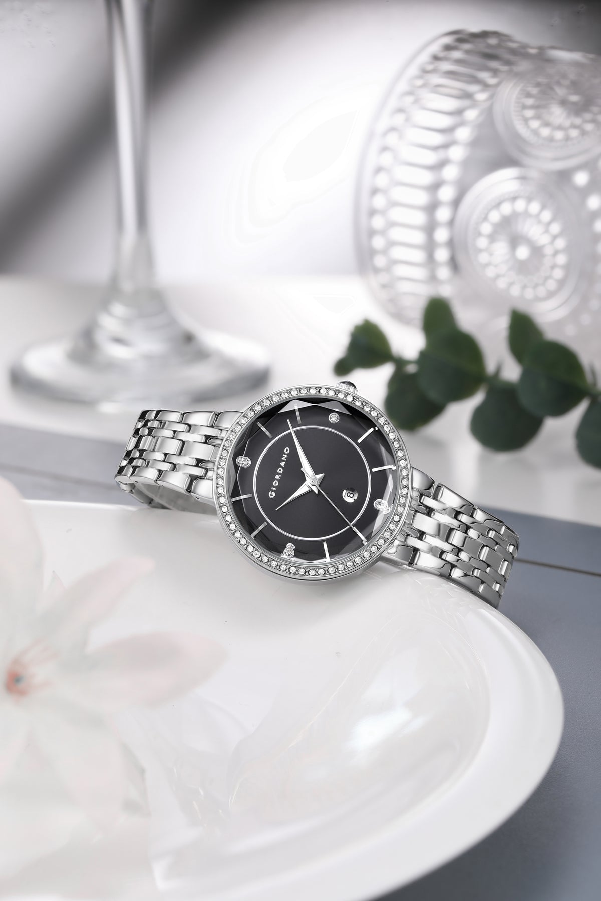 Giordano Stylish Analog Watch for Women – Round cut glass Dial,diamond studed bezel, stainess steel strap and date display | GZ-60110-11