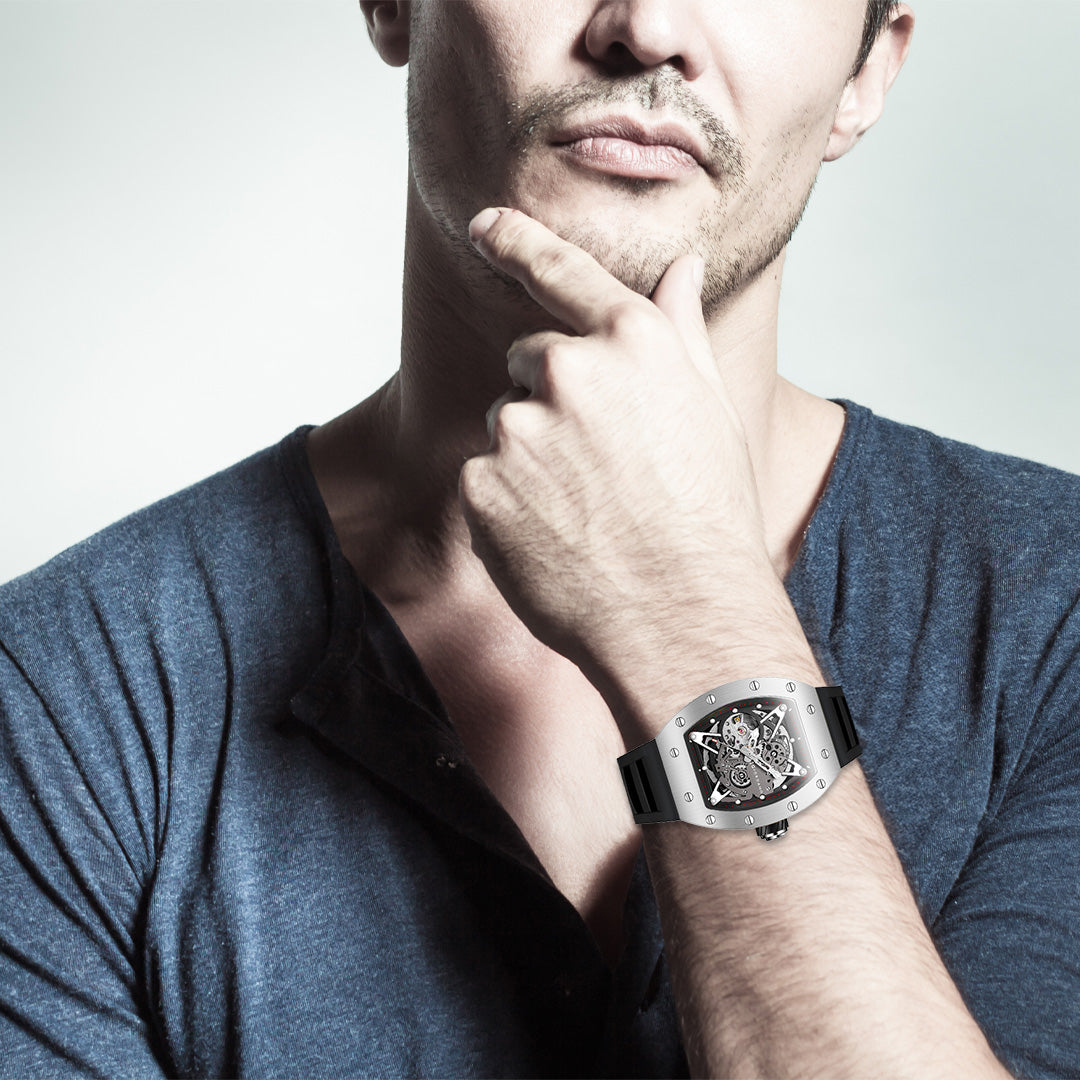 Giordano Automatic Wrist Watch for Men - Open Skeleton Dial | Brushed Steel Case Mechanical Movement with Silicone Strap | GZ-50145-02