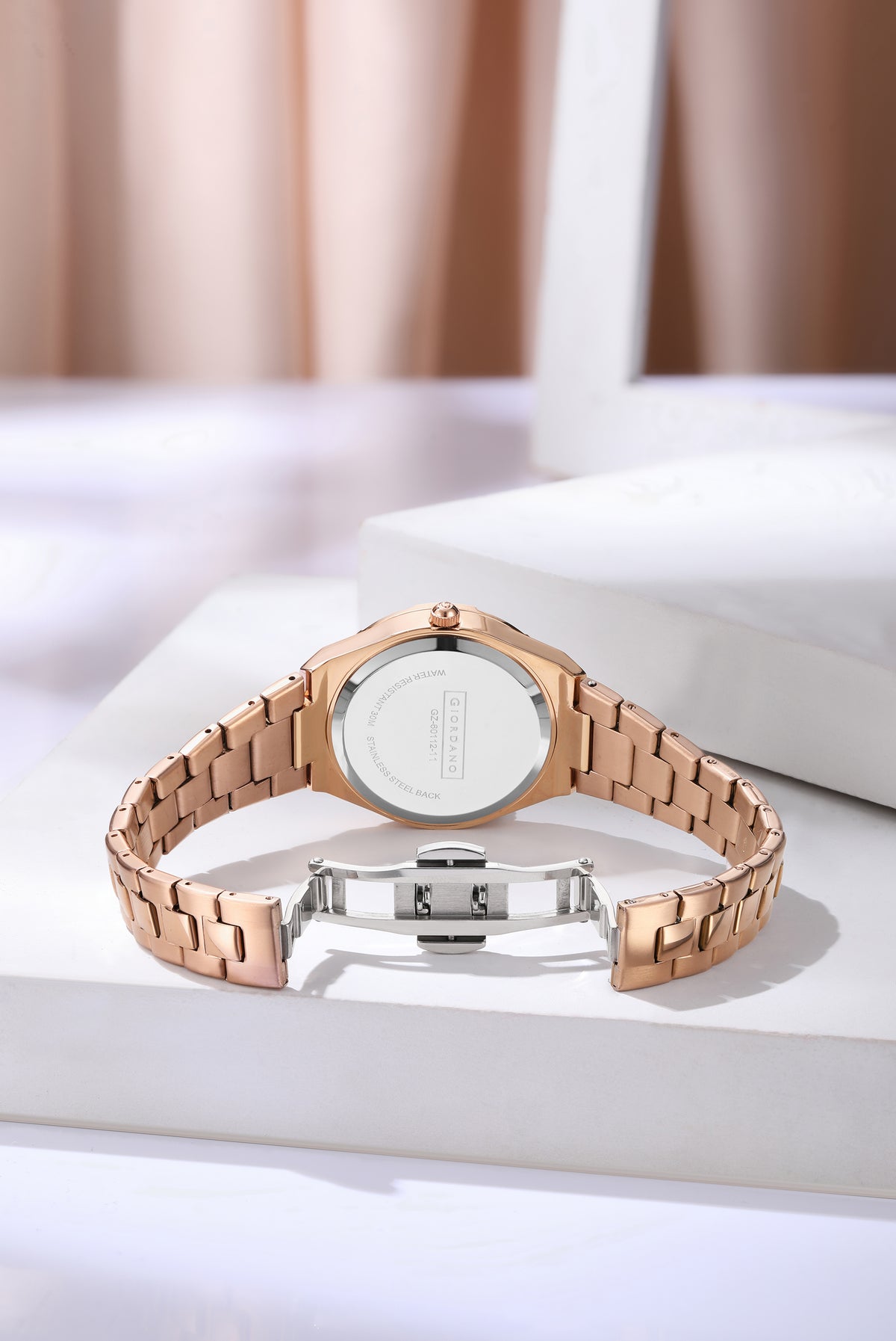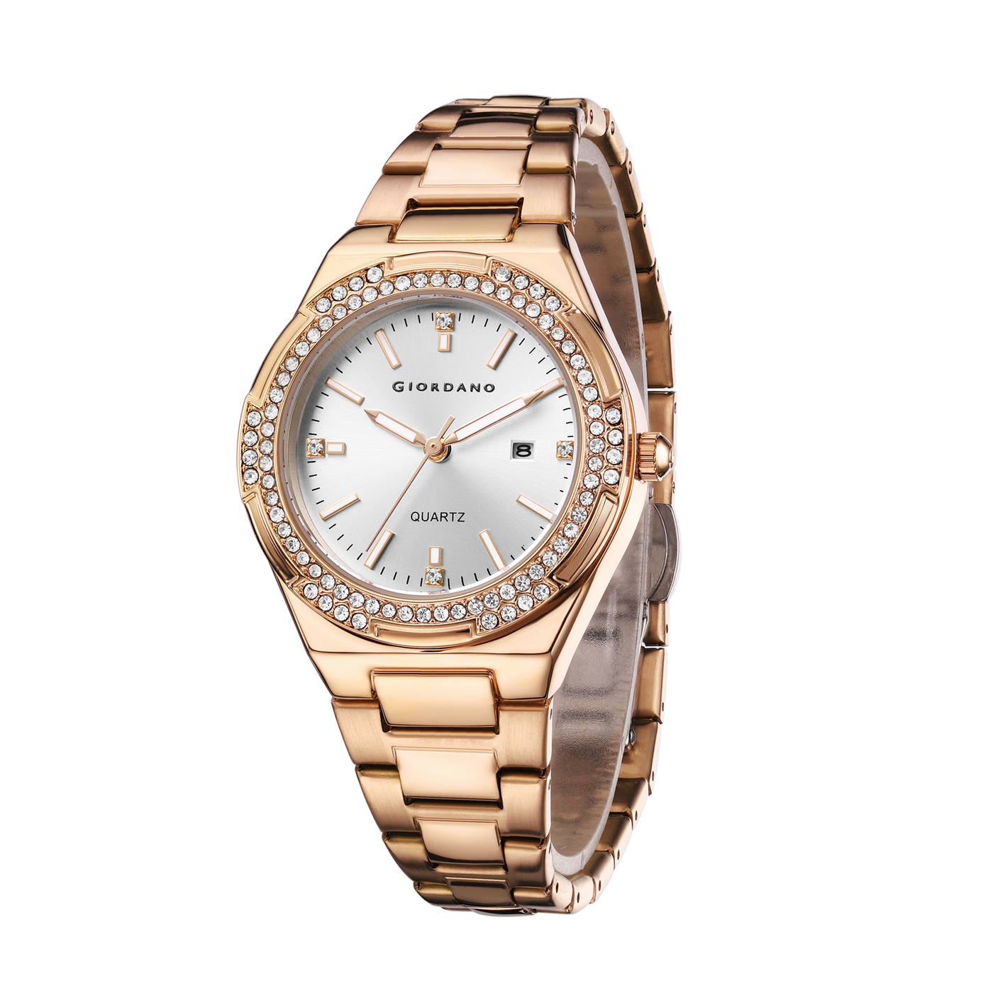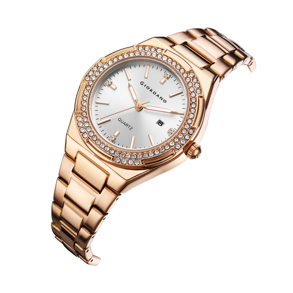 Giordano Analog watch for women with Crystal Bezel, round gloss finish dial, stainless steel strap and date display | GZ-60112-11