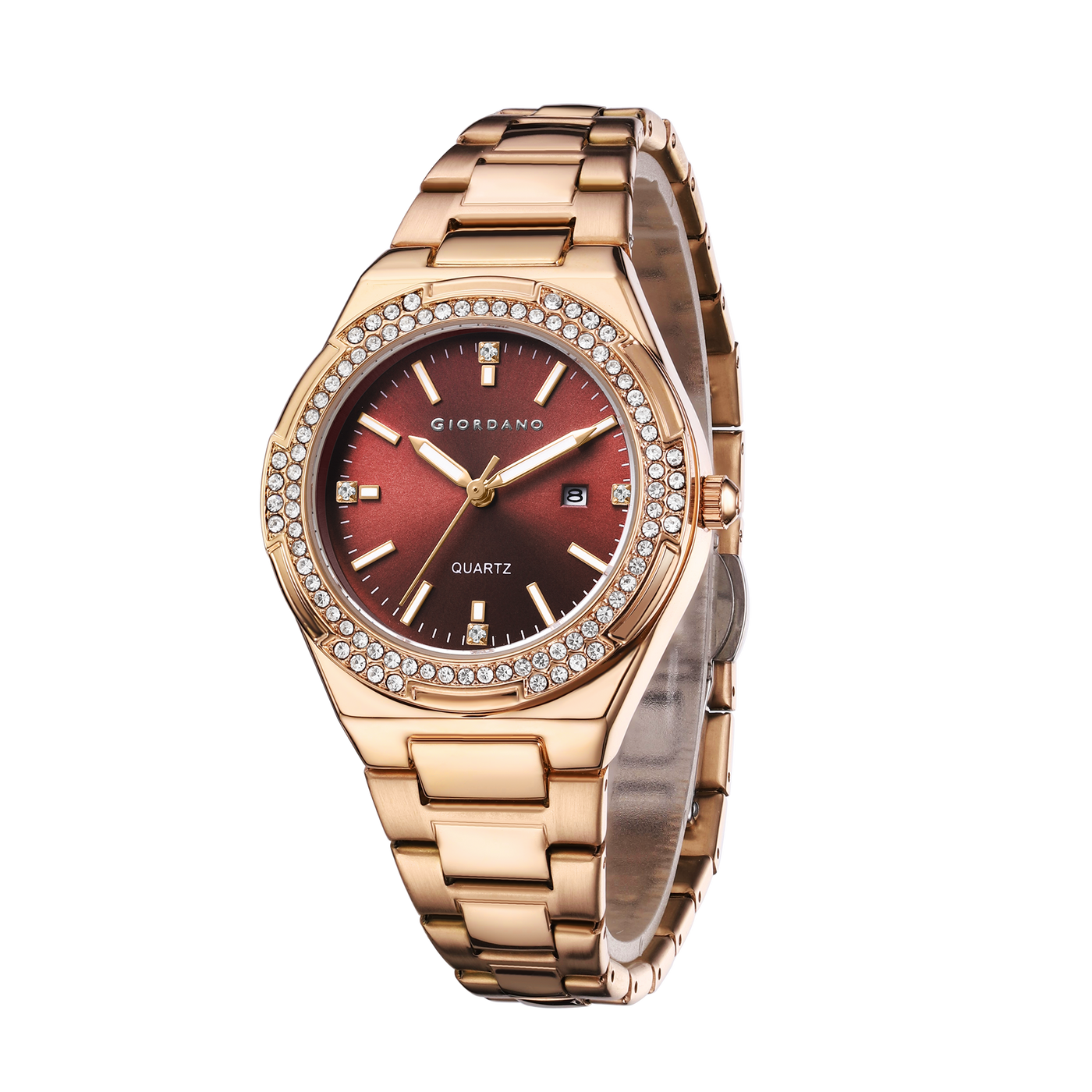 Giordano Analog watch for women with Crystal Bezel, round gloss finish dial, stainless steel strap and date display | GZ-60112-22