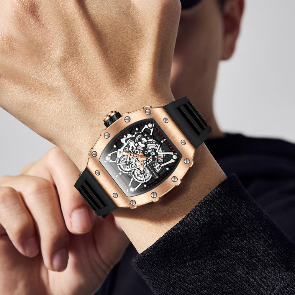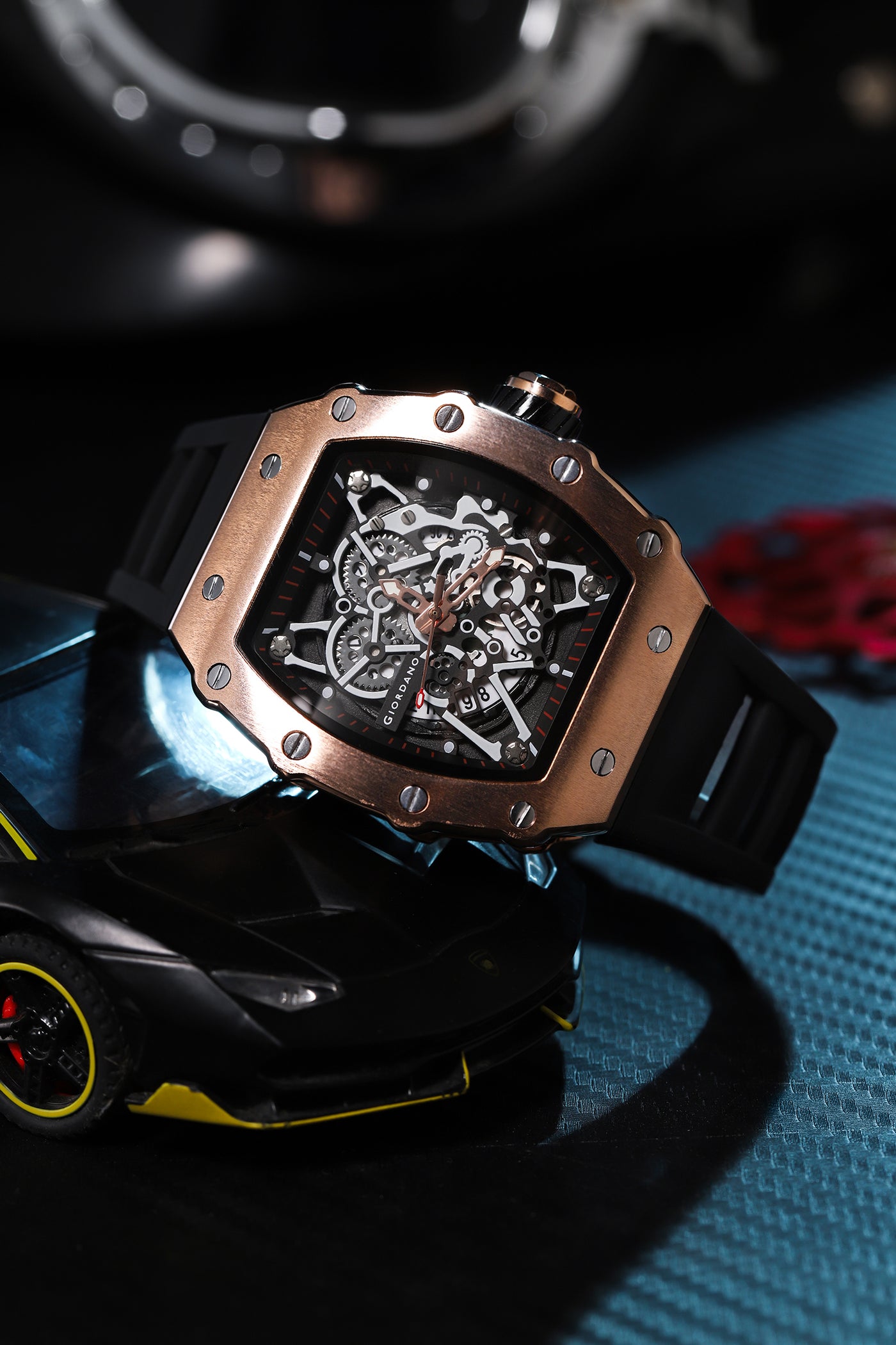 Giordano Analog Watch for Men - Skeleton-Style Dial | Brushed Steel Case with Silicone Strap | GZ-50127-03
