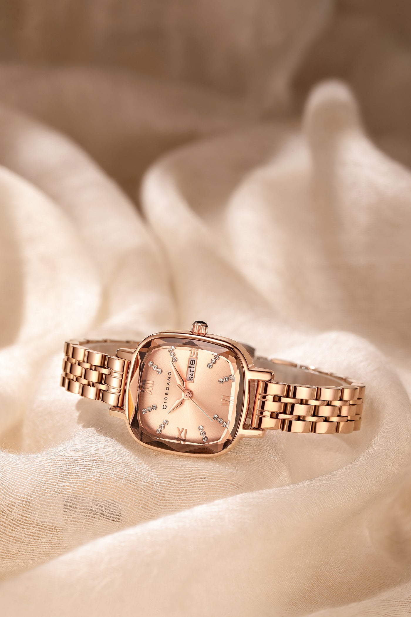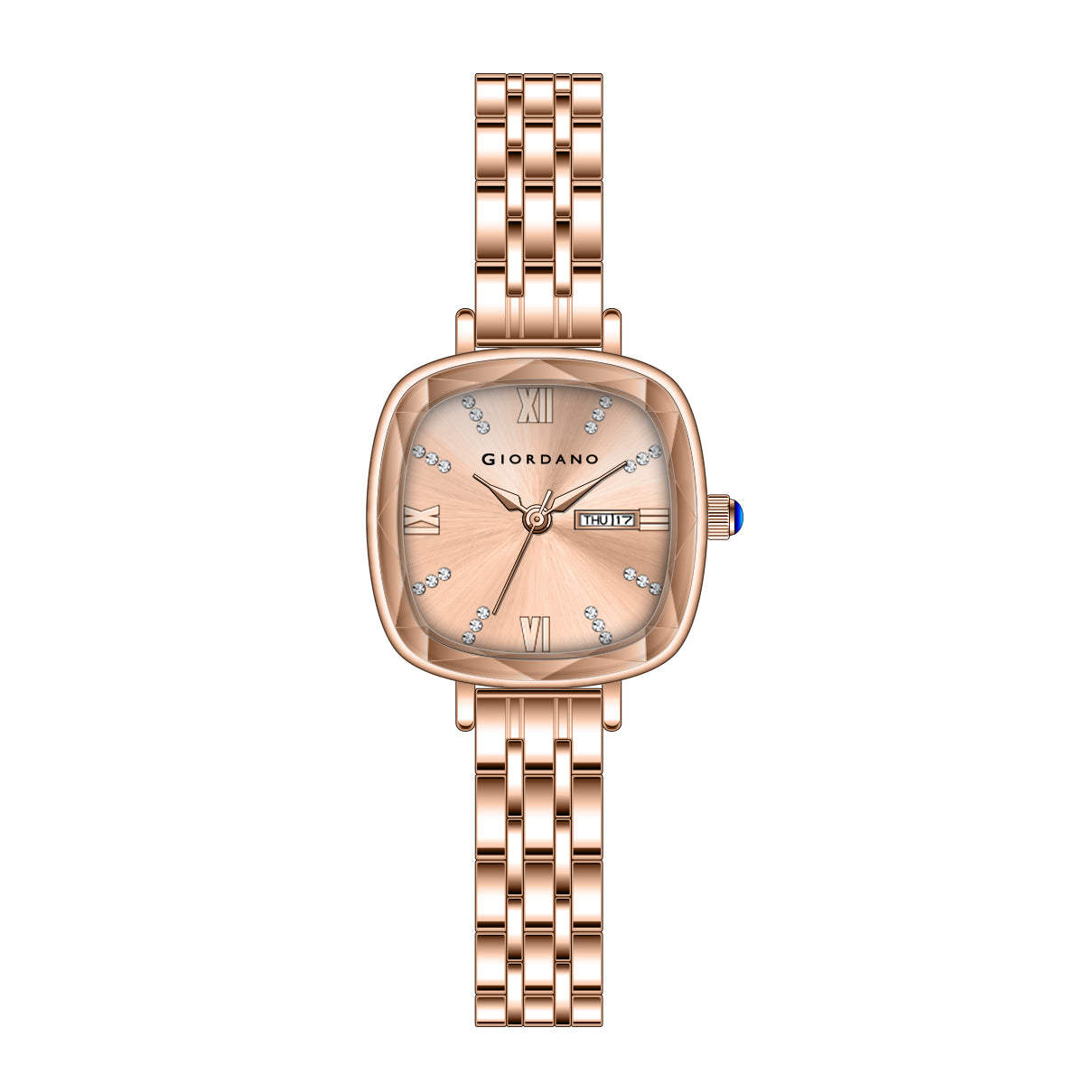 Giordano Elegant Square Rose Gold Watch for Women – Crystal & Roman Hour Markers, Day-Date Display, Stainless Steel Strap | GZ-60097-22