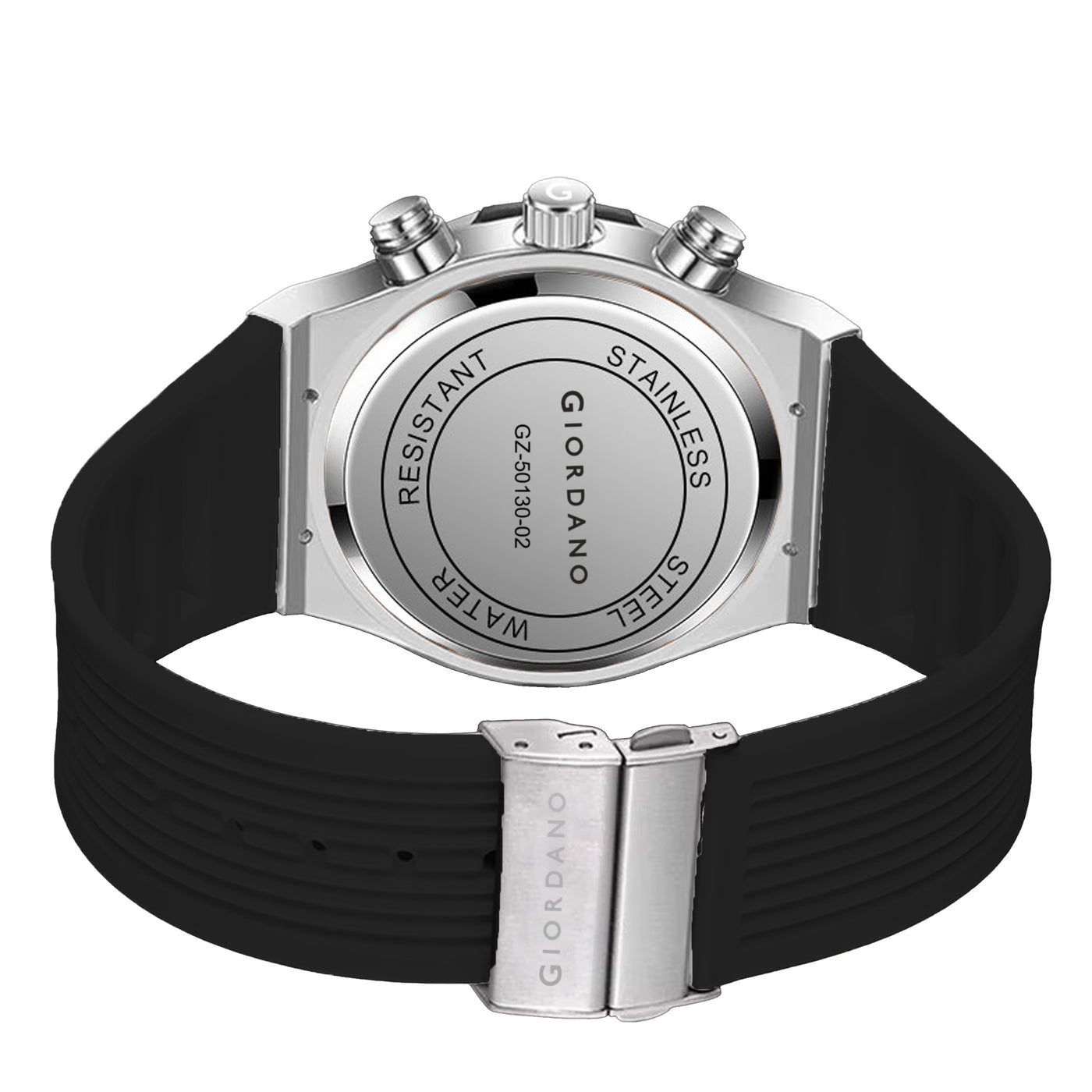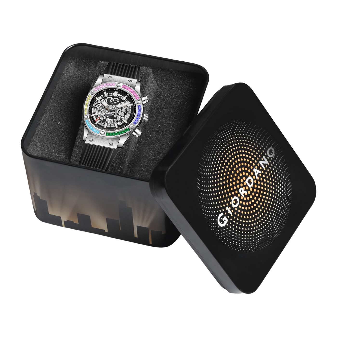 Giordano Multi-Function Watch for Men | Rainbow Crystal Bezel | Skeleton Dial | Black Sillicon Strap | GZ-50130-02