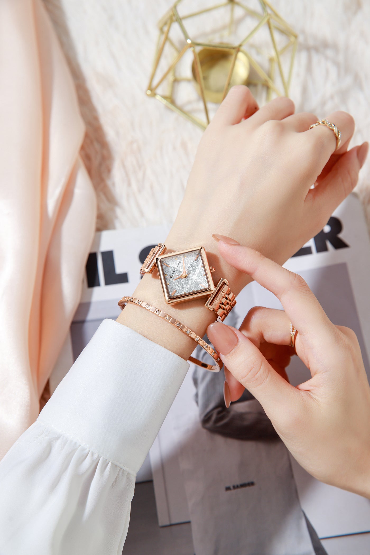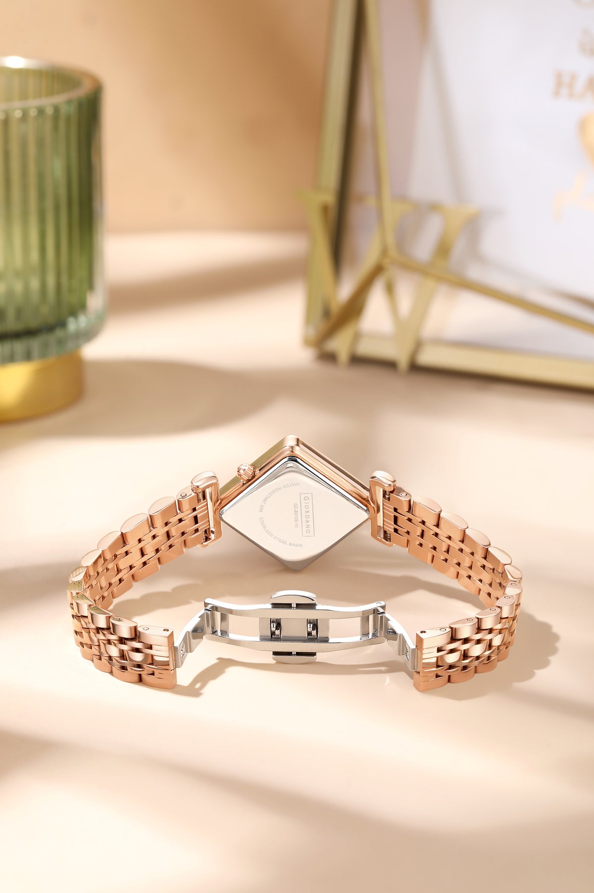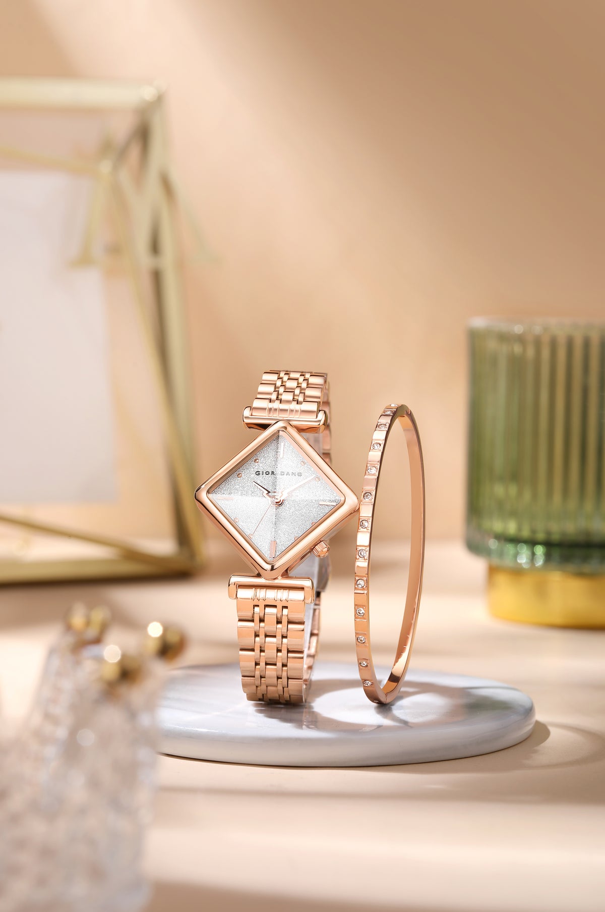 Giordano Rose Gold Analog Watch For Women with Bracelet Set – Diamond-Shaped Shimmer Dial, Crystal Detailing & Stainless Steel Strap – Elegant Gift Combo for Women | GZ-60106-11
