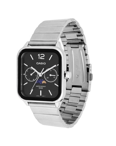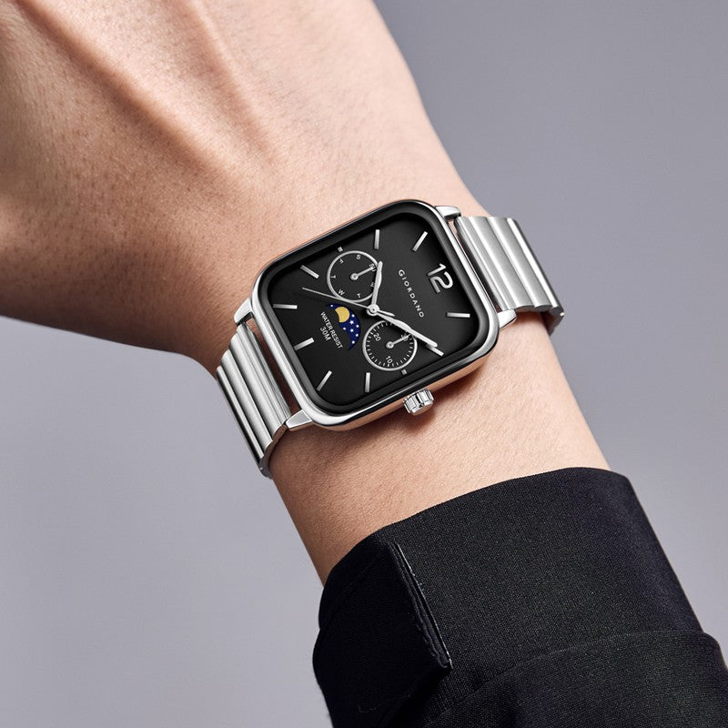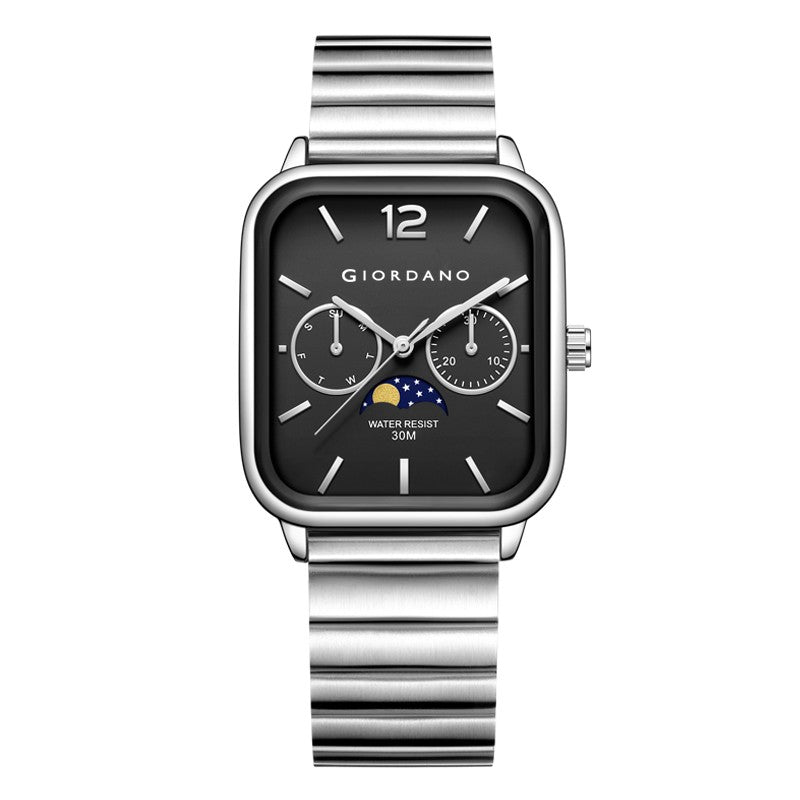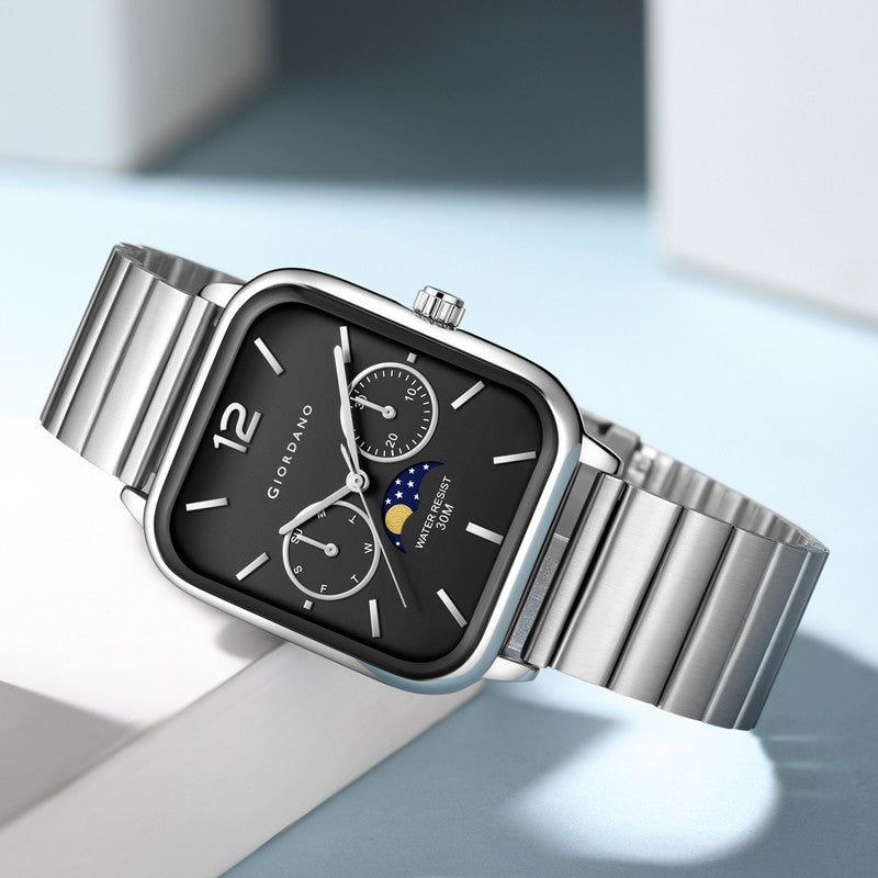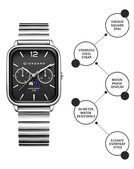 পুরুষদের জন্য জিওর্দানো সিলভার ক্লাসিক স্কয়ার অ্যানালগ ঘড়ি সাথে মুন ফেজ ডিসপ্লে এবং স্টেইনলেস স্টিল স্ট্র্যাপ GZ-50117-11