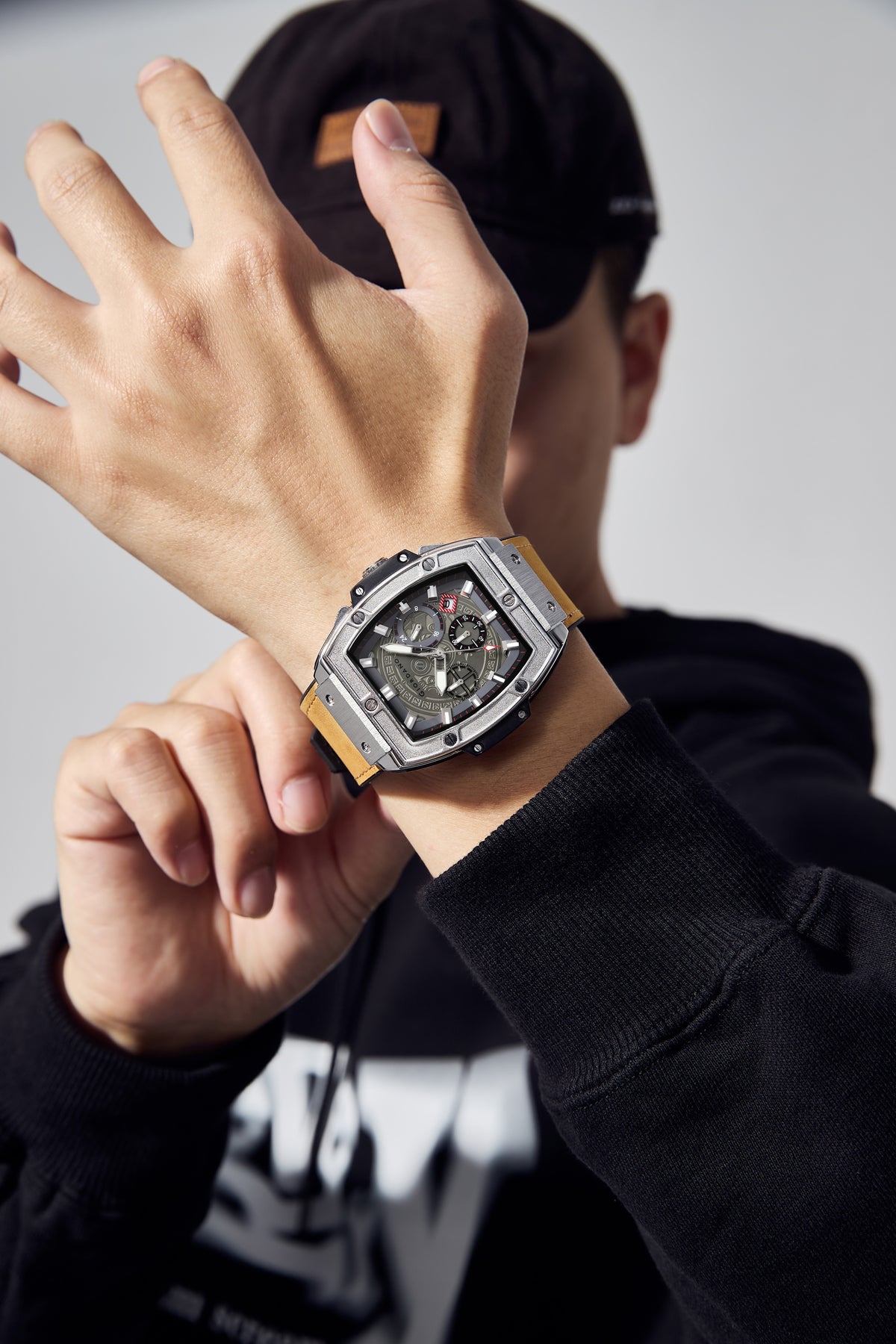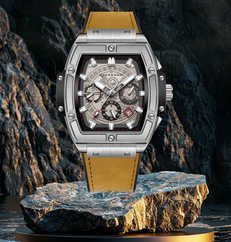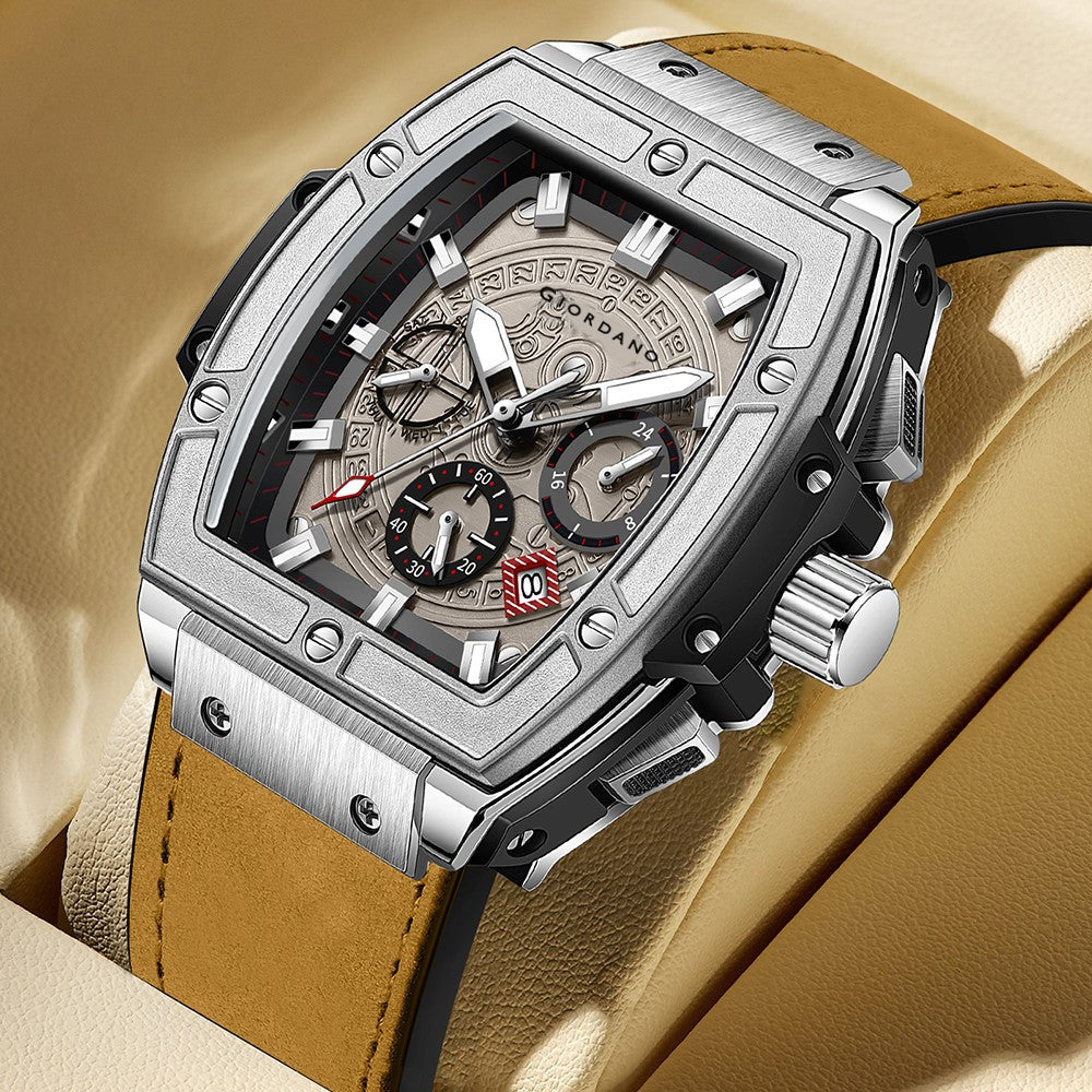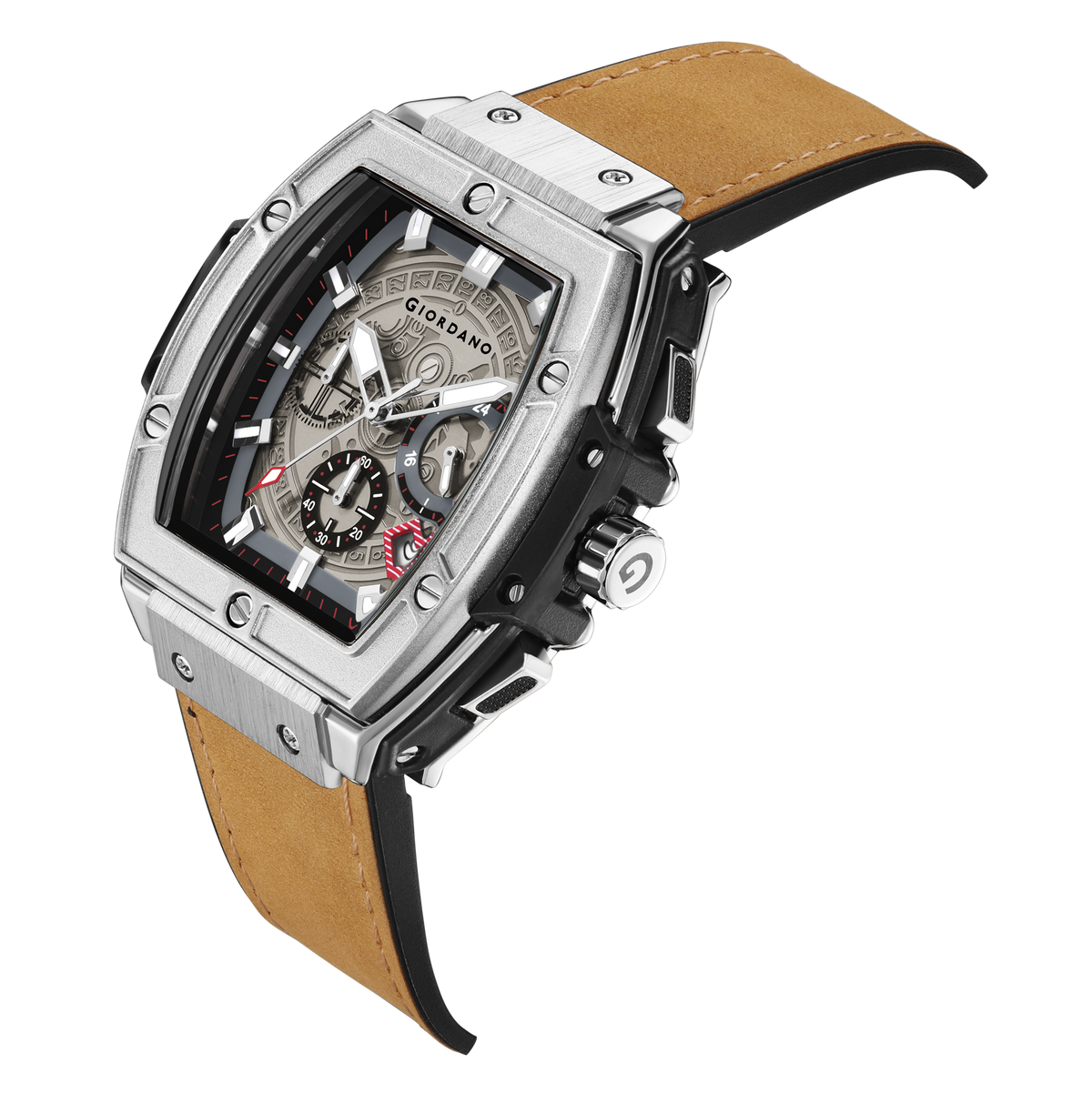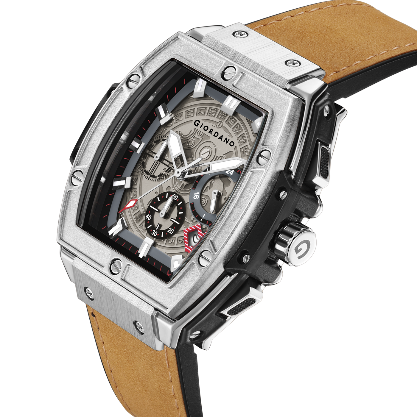 Giordano Terminator Men's Brown Leather Multifunction Watch - with Day, Date, and 24-Hour Sub-Dials | Water Resistant Square Dial Unique Design Wrist Watch for Man | GZ-50098-01