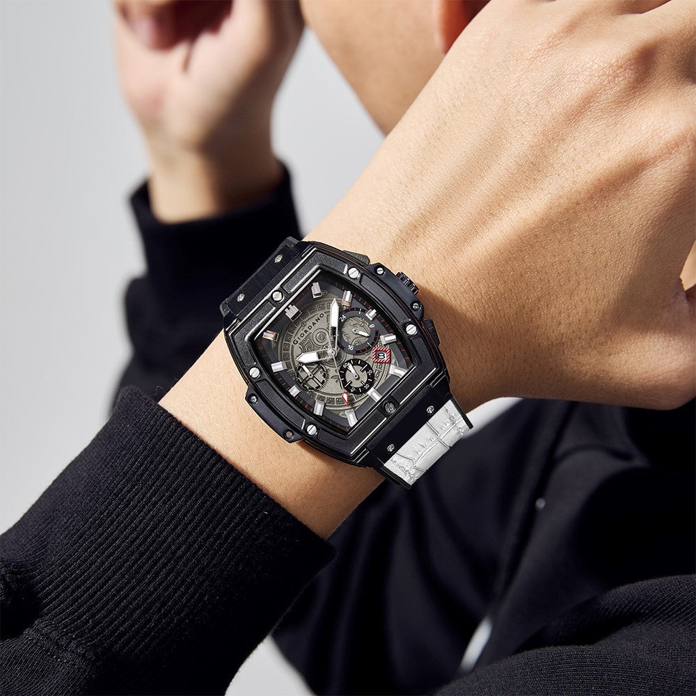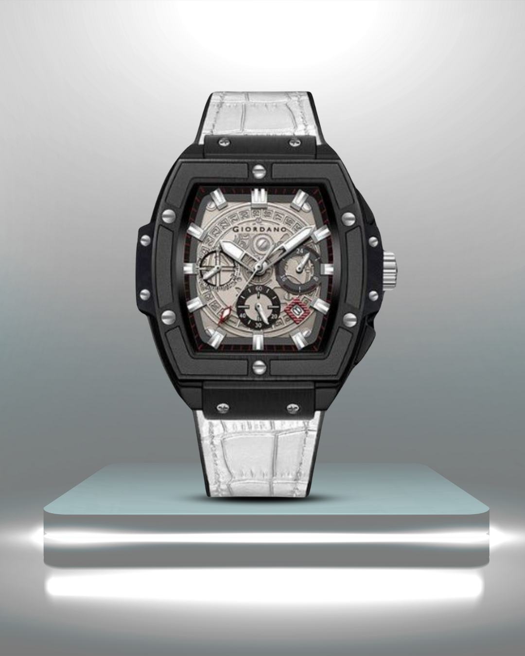 Giordano Terminator White Leather Multifunction Watch for men - with Day, Date, and 24-Hour Sub-Dials | Water Resistant Square Dial Unique Design Wrist Watch for Man | GZ-50098-06