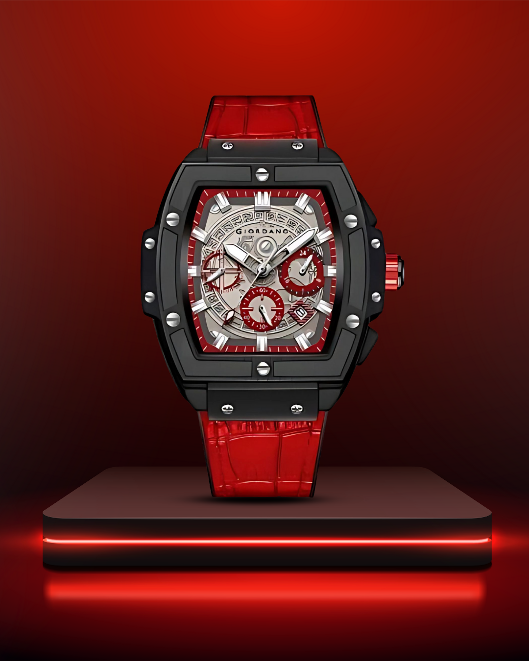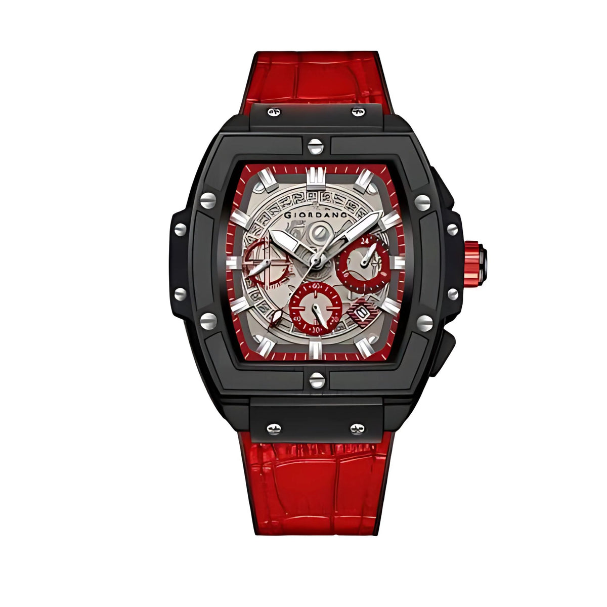 Giordano Terminator Red Leather Multifunction Watch for men - with Day, Date, and 24-Hour Sub-Dials | Water Resistant Square Dial Unique Design Wrist Watch for Man | GZ-50098-04